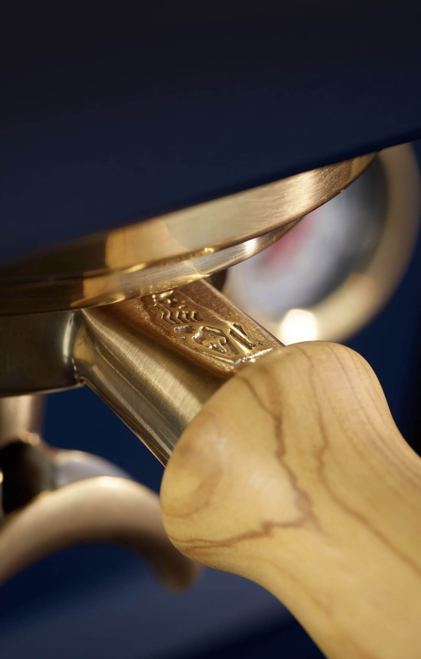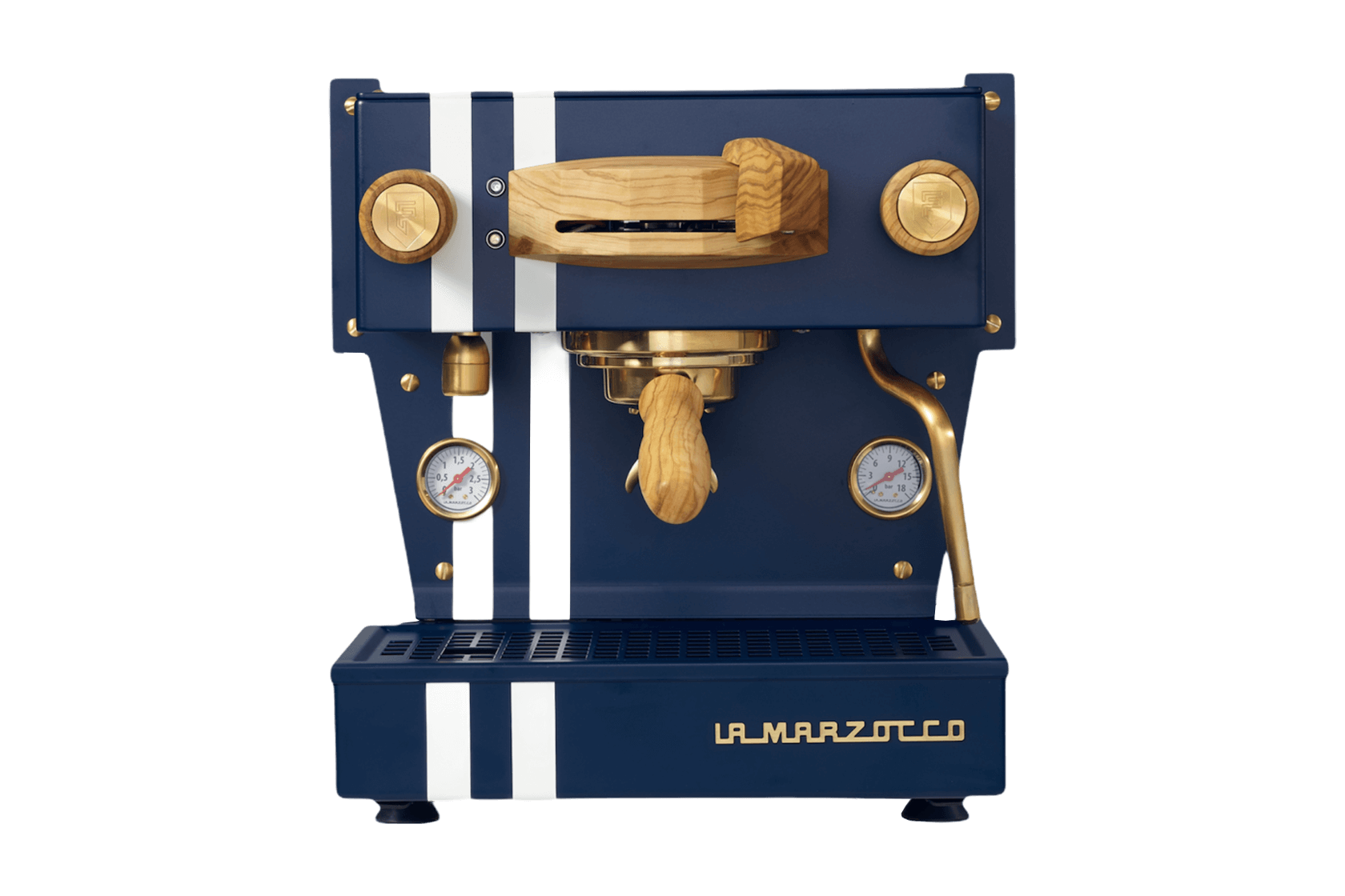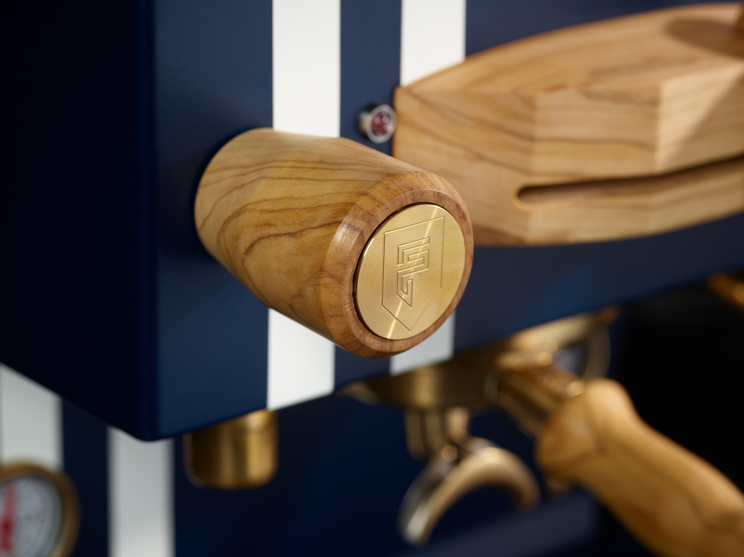 Dampflanze, Heißwasserhahn, beide Manometer sowie Siebträger und Bajonette werden galvanisch vergoldet – für eine dezente Eleganz.