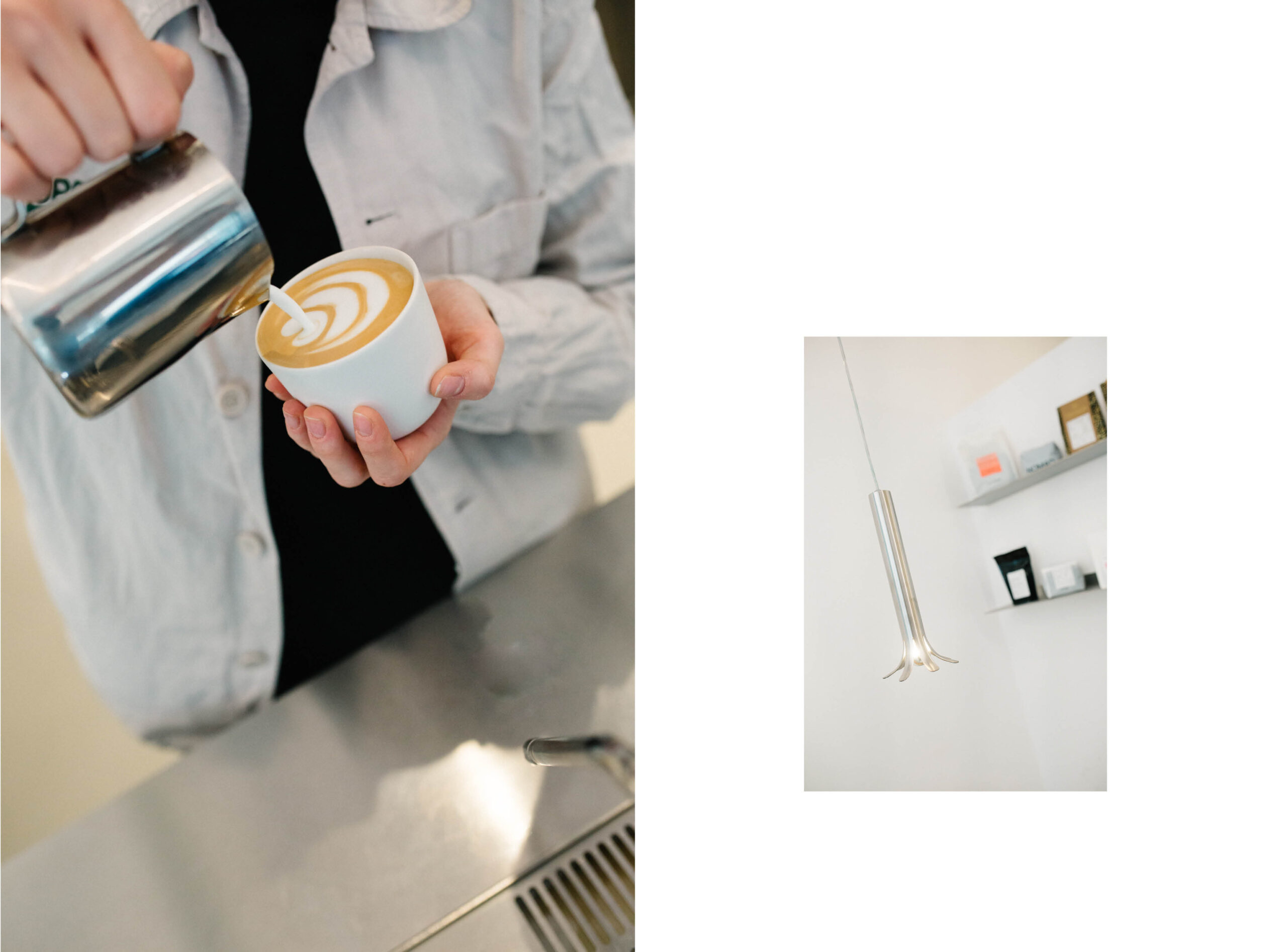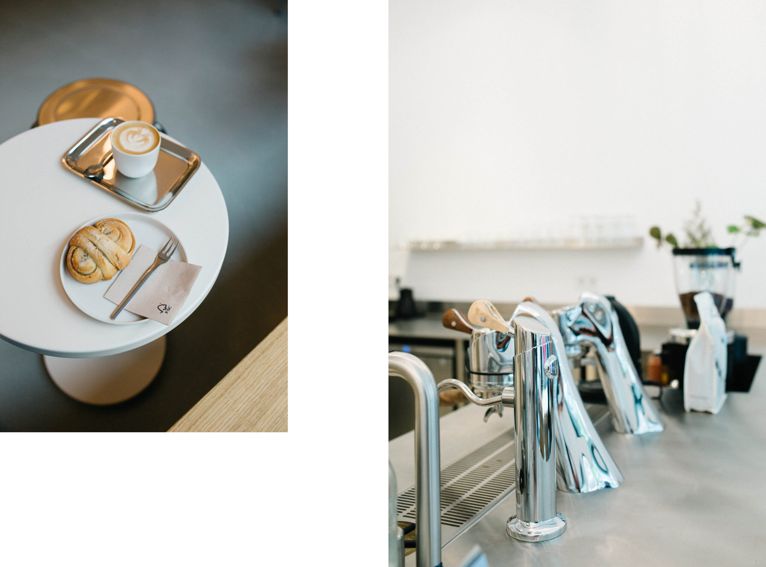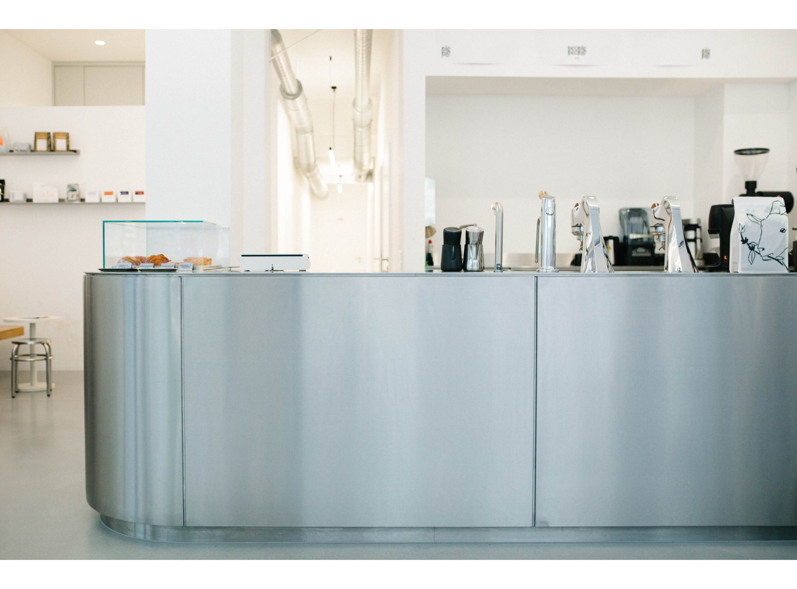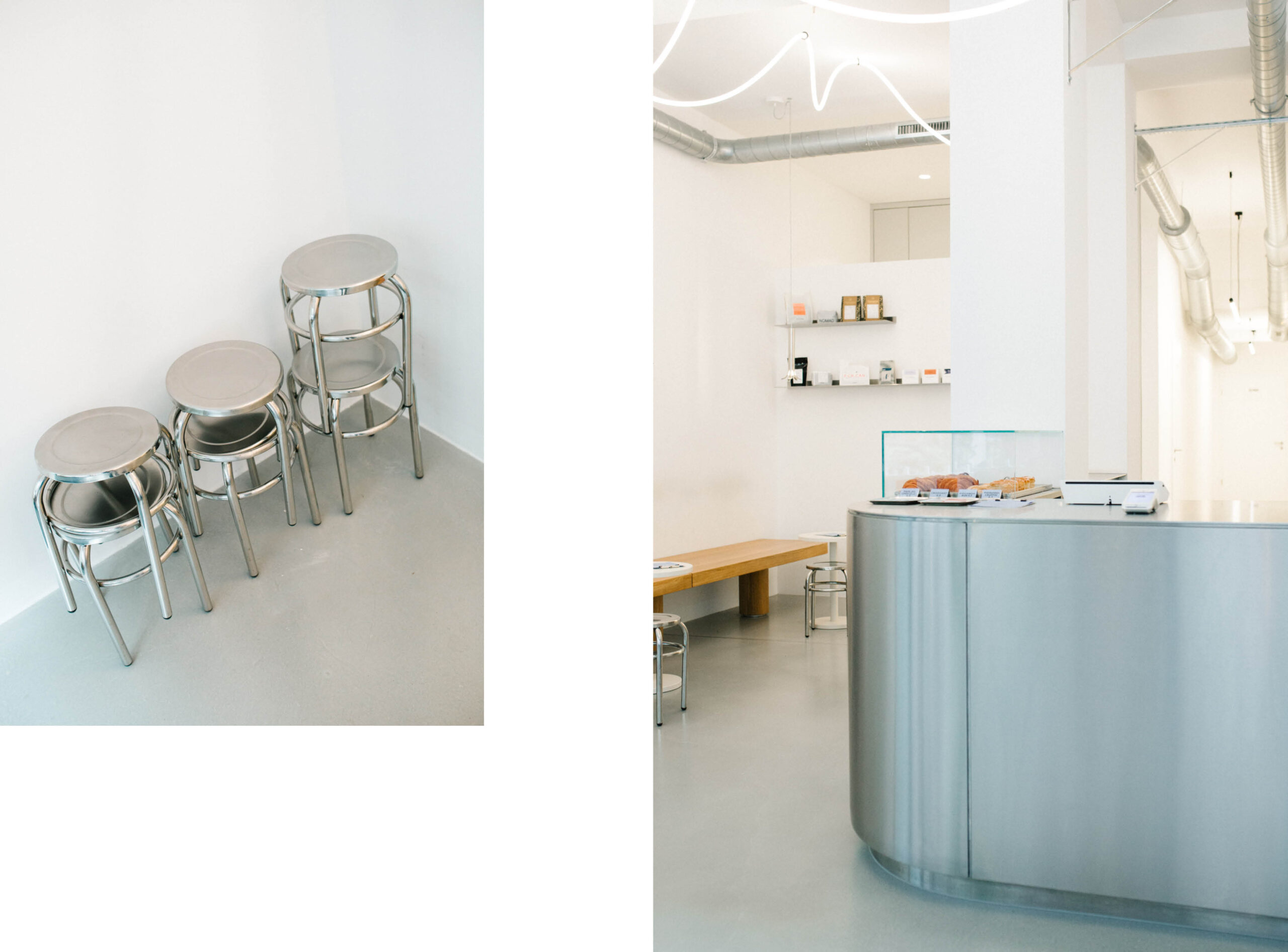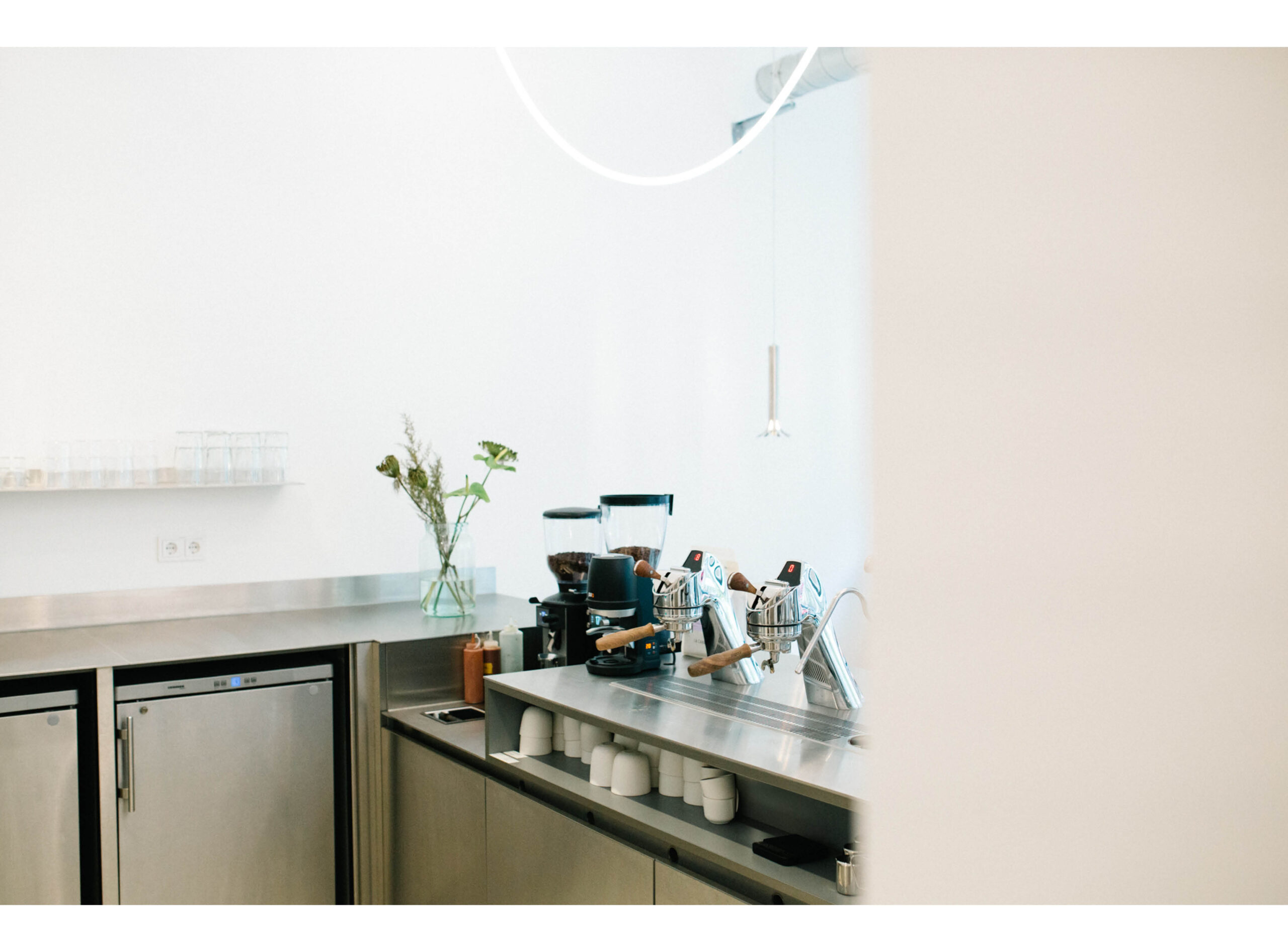 Unser Ziel war es, einen zeitlosen und minimalistischen Raum zu schaffen, der den Fokus ganz auf das Wesentliche – den Kaffee – lenkt. Besonders stolz sind wir auf unsere Edelstahltheke mit der integrierten Modbar. Sie wird elegant ergänzt durch die Eichenbank, die sich als warmes, harmonisches Element durch den gesamten Raum zieht.