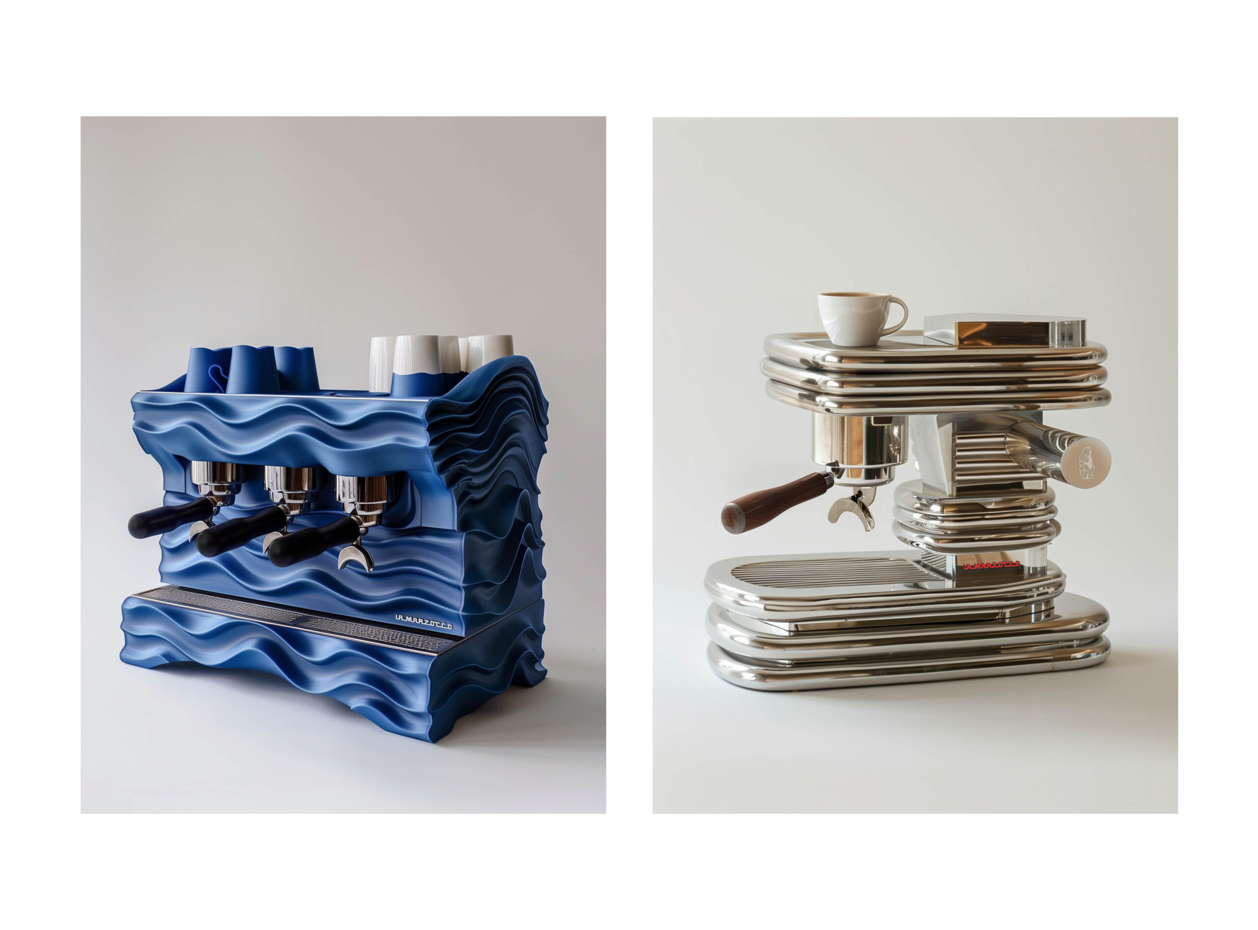 Für La Marzocco hat sie die Möglichkeiten der künstlichen Intelligenz genutzt, um Espressomaschinen aus nachhaltigen Materialien zu entwerfen. Was wäre wenn La Marzocco Espressomaschinen aus recyceltem Kunststoff wären? Aus recyceltem Aluminium? Aus recyceltem Beton? Aus Plastikmüll? Aus recycletem Metallblechen?