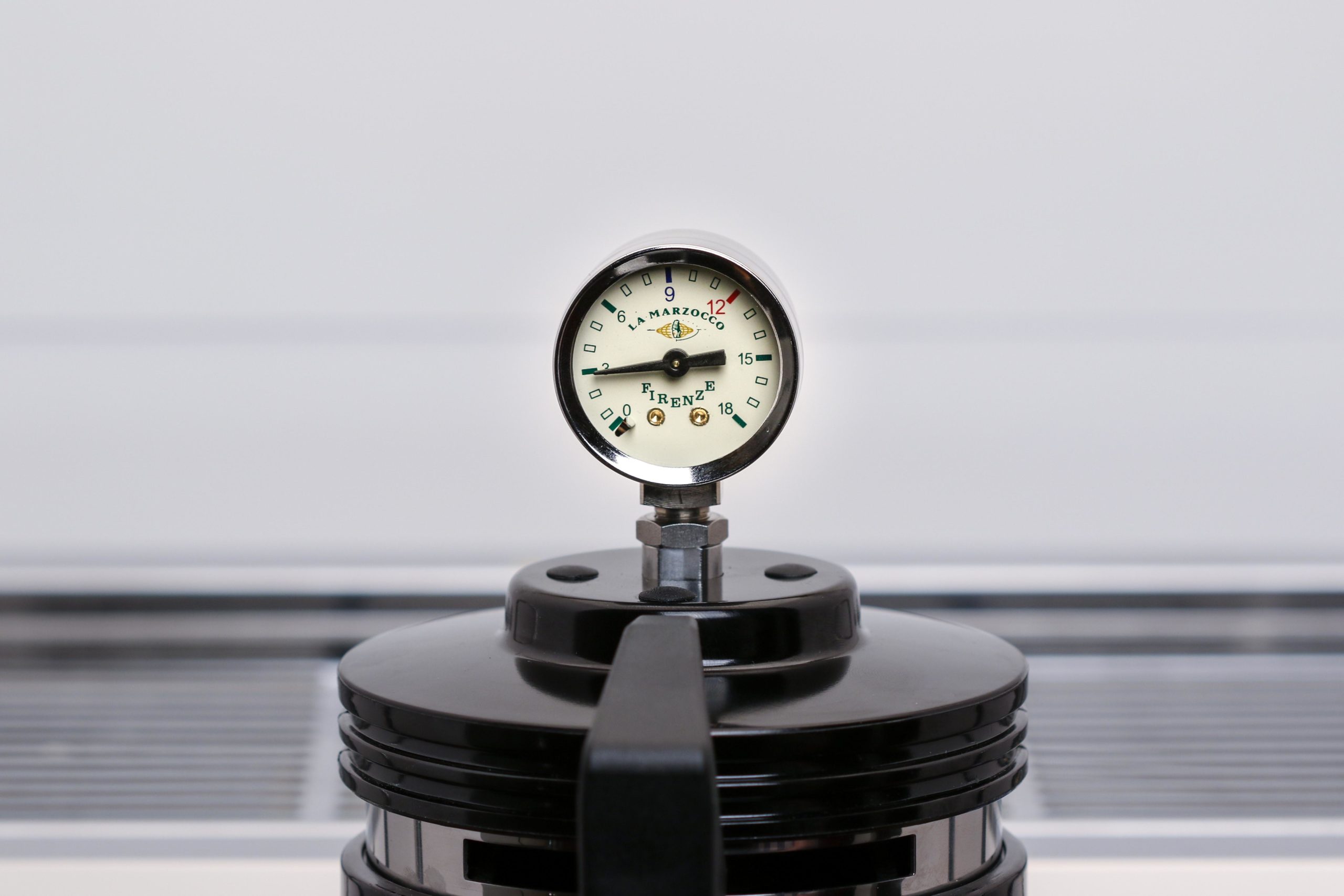 Druck im Handumdrehen ändern. Wir haben einen Druckmesser auf dem Brühgruppenkopf angebracht. Jetzt können Sie den Brühdruck zum Zeitpunkt des Brühvorgangs messen, statt nur im Kessel. In Verbindung mit der Funktion „Vollbereich-Druckregelung bei Pumpe Ein“ ermöglicht dies die manuelle Druckprofilierung bei Verwendung des eingebauten Wassertanks.
